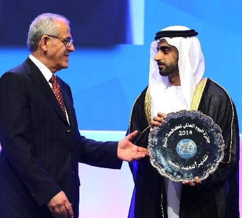 世界卫生安排颁发阿联酋沙迦酋长谢赫苏尔坦·本··卡西米世界烟草操控荣誉奖,以赞誉他本人和沙迦酋长国在控烟方面所做出的尽力和完成的效果。记者安江 摄